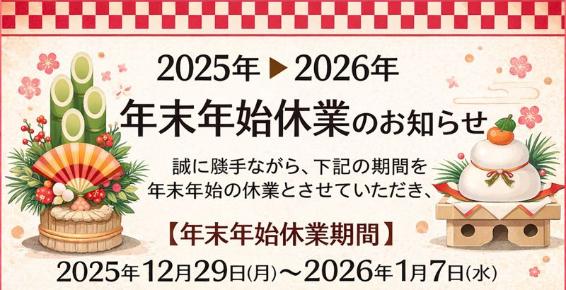 2025年12月29日(月)から2026年1月7日(水)まで、年末年始休業とさせていただきます。休業期間中のお問い合わせは1月8日(木)以降、順次対応いたします。