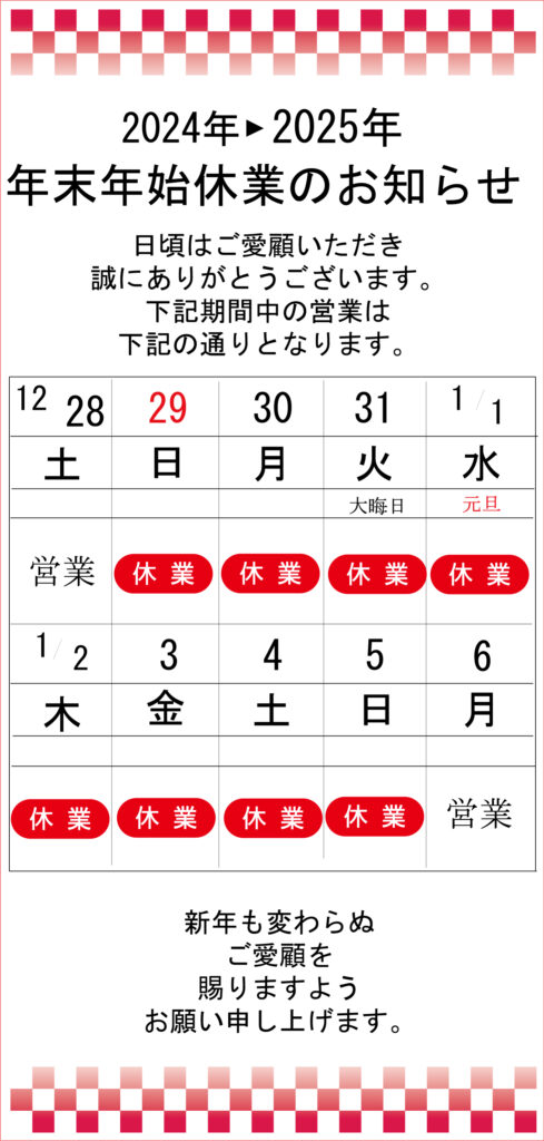誠に勝手ながら12月29日(日)~2025年1月5日(日)まで休業日とさせていただきます。